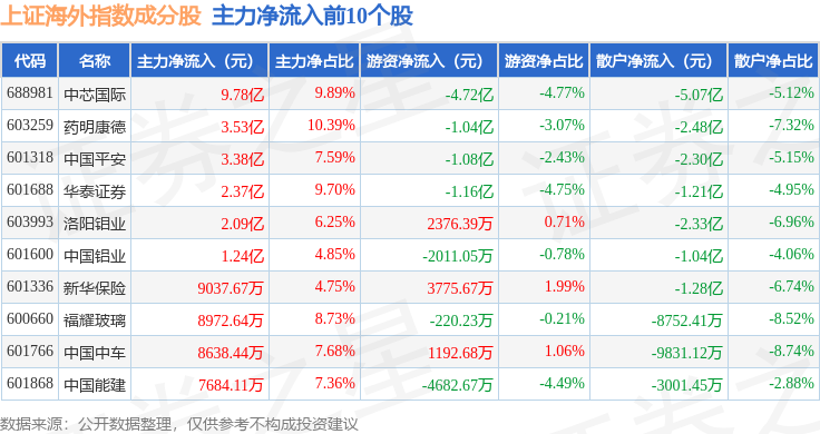 资金流向方面,上证海外(000054)指数成份股当日主力资金净流出合计5.09亿元,游资资金净流入合计2.79亿元,散户资金净流入合计2.31亿元。成份股资金流向详情见下表: