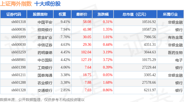 证券之星消息,10月21日,上证海外(000054)指数报收于1555.17点,涨0.87%,成交1095.9亿元,换手率0.4%。当日该指数成份股中,上涨的有49家,中芯国际以3.72%的涨幅领涨,下跌的有16家,兖矿能源以3.1%的跌幅领跌。