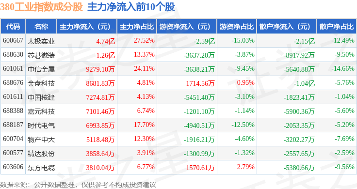 资金流向方面,380工业(000106)指数成份股当日主力资金净流入合计2.91亿元,游资资金净流出合计4.65亿元,散户资金净流入合计1.73亿元。成份股资金流向详情见下表: