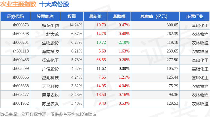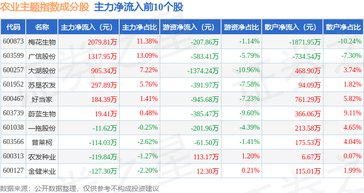 资金流向方面,农业主题(000122)指数成份股当日主力资金净流出合计2.19亿元,游资资金净流出合计1448.23万元,散户资金净流入合计2.34亿元。成份股资金流向详情见下表: