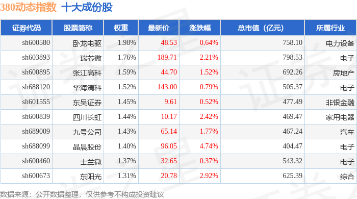 证券之星消息,10月21日,380动态(000141)指数报收于3848.95点,涨1.37%,成交1022.25亿元,换手率1.99%。当日该指数成份股中,上涨的有154家,太极实业以10.0%的涨幅领涨,下跌的有35家,中国卫星以2.23%的跌幅领跌。