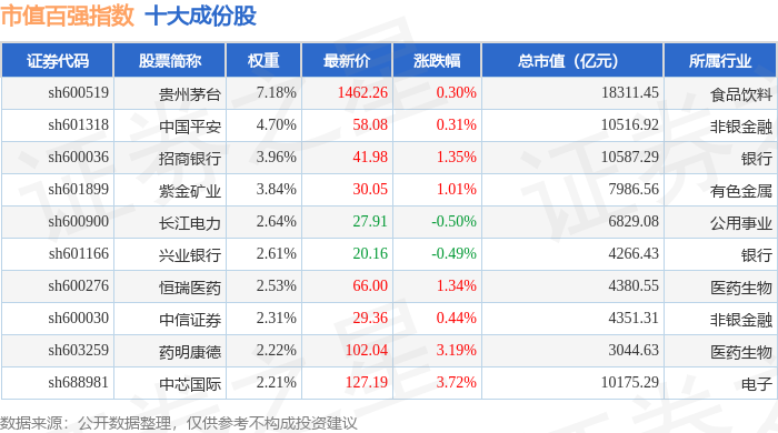 市值百强(000155)指数十大成份股详情如下: