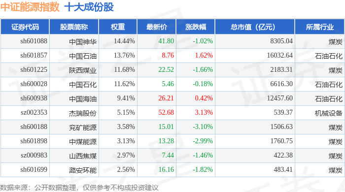 证券之星消息,10月21日,中证能源(000928)指数报收于2880.51点,跌0.18%,成交196.66亿元,换手率0.59%。当日该指数成份股中,上涨的有12家,石化油服以10.05%的涨幅领涨,下跌的有13家,兖矿能源以3.1%的跌幅领跌。