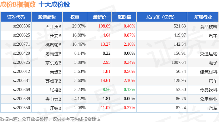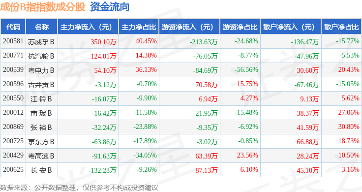 资金流向方面,成份B指(399003)指数成份股当日主力资金净流入合计172.63万元,游资资金净流出合计180.65万元,散户资金净流入合计8.01万元。成份股资金流向详情见下表: