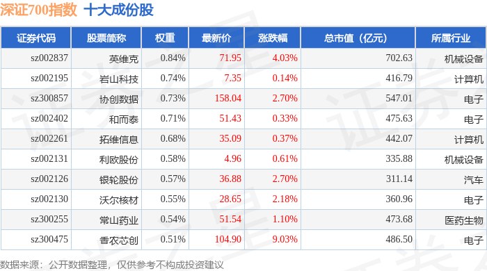 深证700(399010)指数十大成份股详情如下: