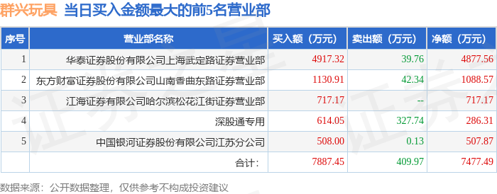 证券之星消息,沪深交易所2025年10月21日公布的交易公开信息显示,群兴玩具(002575)因日跌幅偏离值达到7%的前5只证券登上龙虎榜。此次是近5个交易日内第1次上榜。