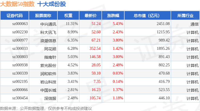 证券之星消息,10月21日,大数据50(399282)指数报收于5455.34点,涨2.04%,成交465.63亿元,换手率2.45%。当日该指数成份股中,上涨的有46家,太极股份以5.59%的涨幅领涨,下跌的有4家,迪普科技以1.44%的跌幅领跌。