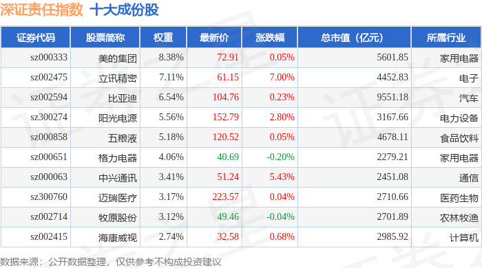 深证责任(399341)指数十大成份股详情如下: