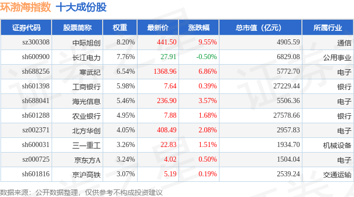 证券之星消息,10月21日,环渤海(399357)指数报收于3475.46点,涨1.85%,成交981.04亿元,换手率0.28%。当日该指数成份股中,上涨的有29家,中际旭创以9.55%的涨幅领涨,下跌的有10家,中国神华以1.02%的跌幅领跌。