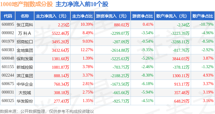 资金流向方面,1000地产(399367)指数成份股当日主力资金净流入合计2.72亿元,游资资金净流出合计1.32亿元,散户资金净流出合计1.4亿元。成份股资金流向详情见下表: