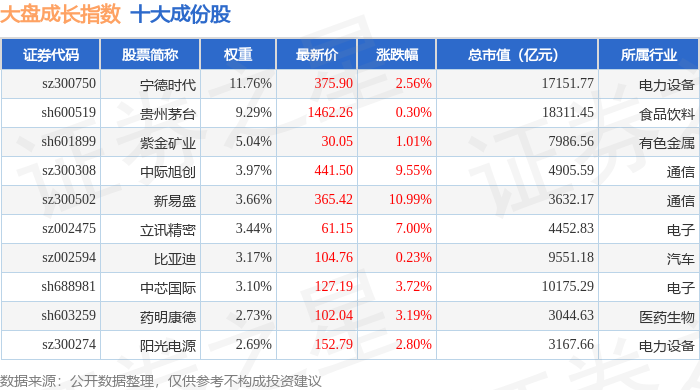 证券之星消息,10月21日,大盘成长(399372)指数报收于5220.63点,涨2.29%,成交2295.75亿元,换手率0.84%。当日该指数成份股中,上涨的有50家,新易盛以10.99%的涨幅领涨,下跌的有11家,兖矿能源以3.1%的跌幅领跌。