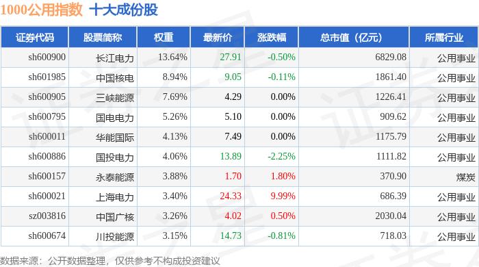 证券之星消息,10月21日,1000公用(399390)指数报收于2696.7点,涨0.58%,成交198.65亿元,换手率0.92%。当日该指数成份股中,上涨的有31家,上海电力以9.99%的涨幅领涨,下跌的有11家,国投电力以2.25%的跌幅领跌。