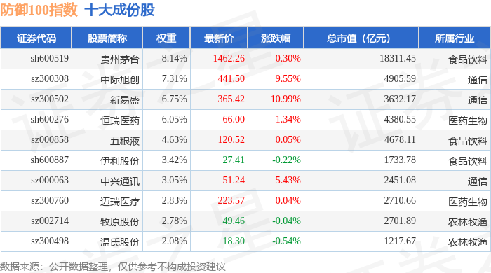 证券之星消息,10月21日,防御100(399403)指数报收于8838.37点,涨1.99%,成交1223.93亿元,换手率0.83%。当日该指数成份股中,上涨的有72家,新易盛以10.99%的涨幅领涨,下跌的有25家,燕京啤酒以4.56%的跌幅领跌。
