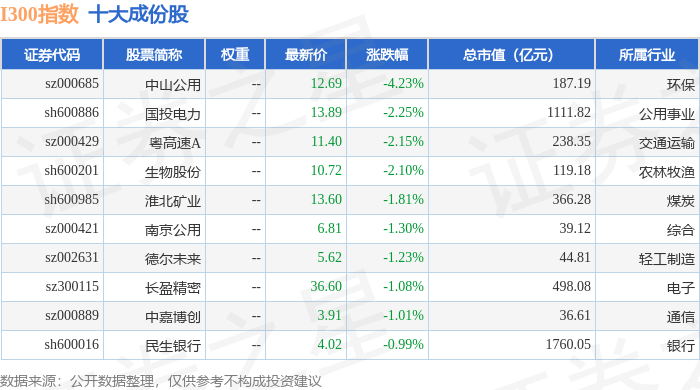 I300(399416)指数十大成份股详情如下: