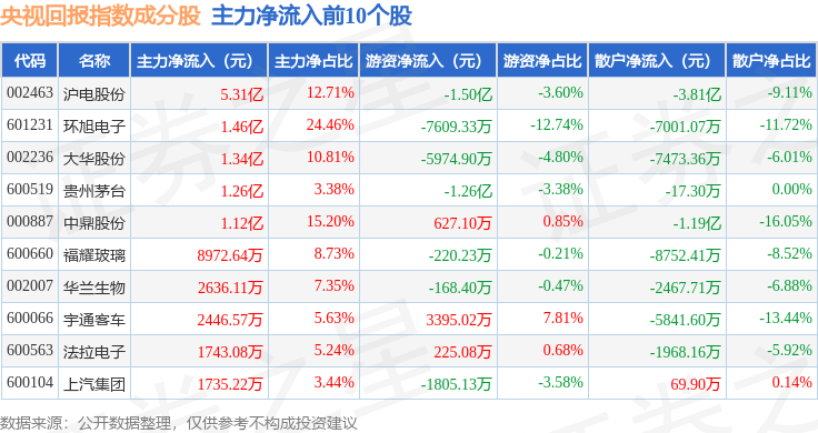 资金流向方面,央视回报(399553)指数成份股当日主力资金净流入合计4.27亿元,游资资金净流出合计4.9亿元,散户资金净流入合计6288.85万元。成份股资金流向详情见下表: