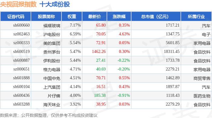证券之星消息,10月21日,央视回报(399553)指数报收于7360.88点,涨0.79%,成交352.97亿元,换手率1.05%。当日该指数成份股中,上涨的有36家,环旭电子以10.03%的涨幅领涨,下跌的有13家,古井贡酒以1.05%的跌幅领跌。