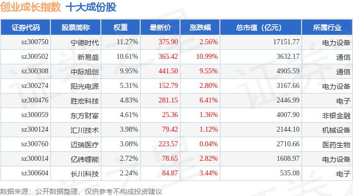 创业成长(399667)指数十大成份股详情如下:
