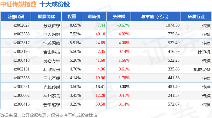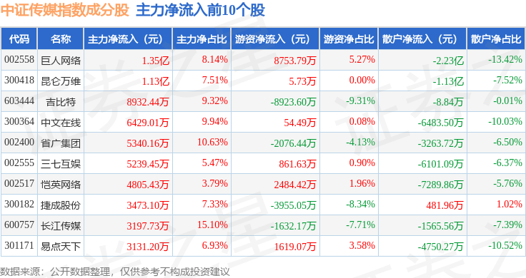 资金流向方面,中证传媒(399971)指数成份股当日主力资金净流出合计1535.14万元,游资资金净流入合计9360.21万元,散户资金净流出合计7825.07万元。成份股资金流向详情见下表: