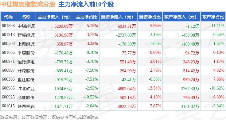 资金流向方面,中证煤炭(399998)指数成份股当日主力资金净流出合计13.62亿元,游资资金净流入合计6.98亿元,散户资金净流入合计6.64亿元。成份股资金流向详情见下表: