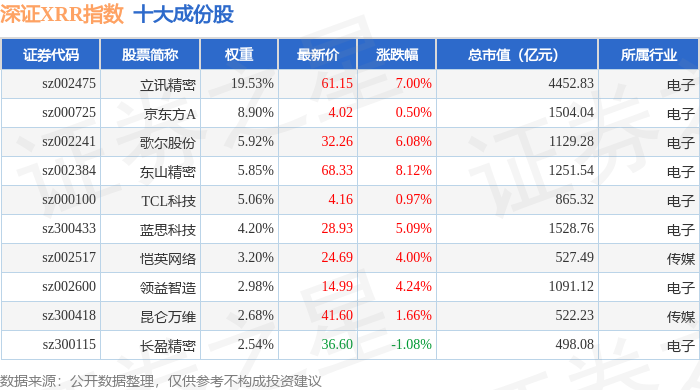 证券之星消息,10月21日,深证XRR(470046)指数报收于2415.0点,涨3.43%,成交657.87亿元,换手率2.21%。当日该指数成份股中,上涨的有46家,东山精密以8.12%的涨幅领涨,下跌的有4家,亿道信息以6.62%的跌幅领跌。