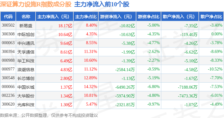 资金流向方面,深证算力设施R(470051)指数成份股当日主力资金净流入合计68.49亿元,游资资金净流出合计36.55亿元,散户资金净流出合计31.95亿元。成份股资金流向详情见下表: