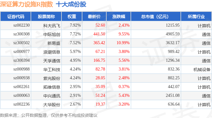 证券之星消息,10月21日,深证算力设施R(470051)指数报收于11943.38点,涨3.56%,成交1186.23亿元,换手率3.11%。当日该指数成份股中,上涨的有48家,新易盛以10.99%的涨幅领涨,下跌的有2家,南天信息以1.17%的跌幅领跌。