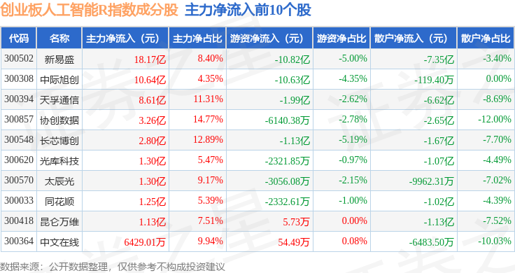 资金流向方面,创业板人工智能R(470070)指数成份股当日主力资金净流入合计49.09亿元,游资资金净流出合计27.62亿元,散户资金净流出合计21.47亿元。成份股资金流向详情见下表:
