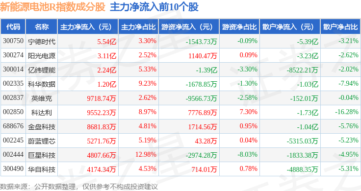 资金流向方面,新能源电池R(480027)指数成份股当日主力资金净流入合计14.36亿元,游资资金净流出合计2.39亿元,散户资金净流出合计11.97亿元。成份股资金流向详情见下表: