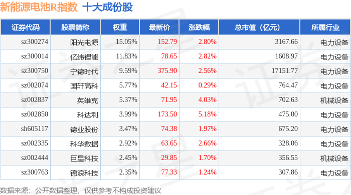 新能源电池R(480027)指数十大成份股详情如下:
