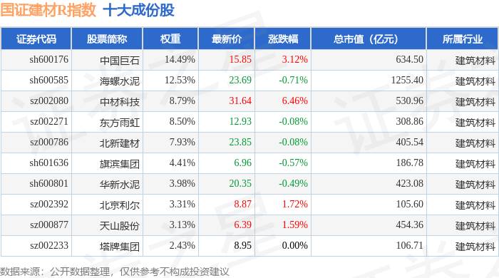 证券之星消息,10月21日,国证建材R(480048)指数报收于6911.21点,涨1.27%,成交78.55亿元,换手率1.55%。当日该指数成份股中,上涨的有21家,中材科技以6.46%的涨幅领涨,下跌的有6家,沧州明珠以2.93%的跌幅领跌。