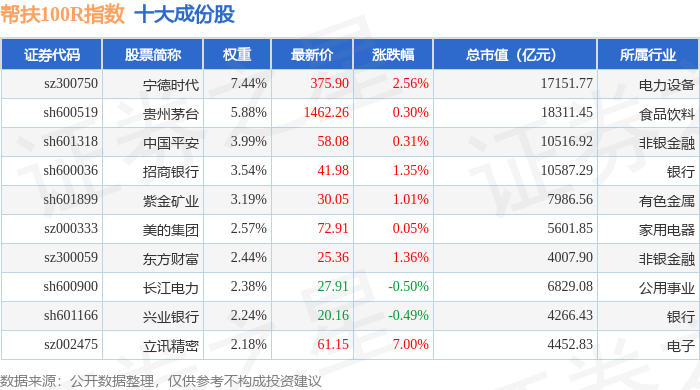 帮扶100R(480065)指数十大成份股详情如下: