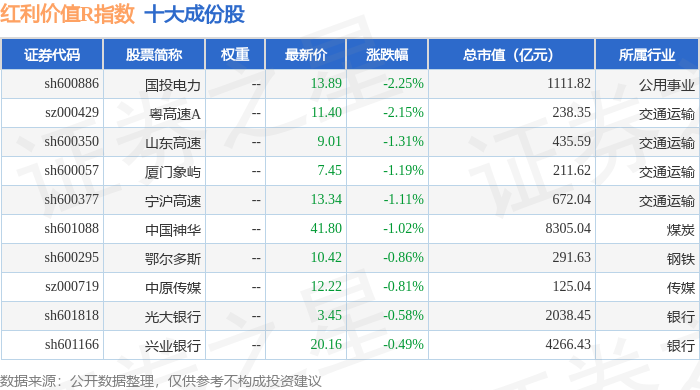 资金流向方面,红利价值R(489016)指数成份股当日主力资金净流出合计11.33亿元,游资资金净流出合计1.24亿元,散户资金净流入合计12.57亿元。成份股资金流向详情见下表:
