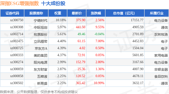 证券之星消息,10月21日,深指ESG增强(970032)指数报收于1545.22点,涨2.54%,成交3346.56亿元,换手率1.59%。当日该指数成份股中,上涨的有158家,新易盛以10.99%的涨幅领涨,下跌的有39家,燕京啤酒以4.56%的跌幅领跌。