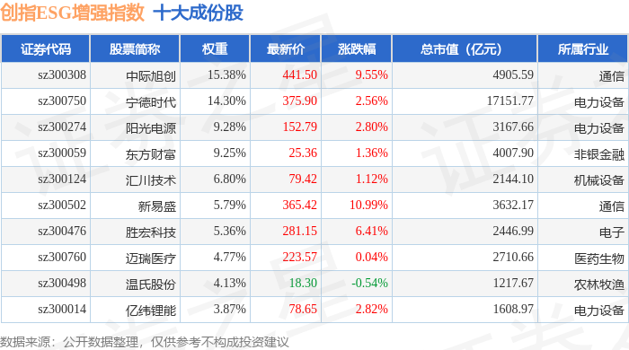 证券之星消息,10月21日,创指ESG增强(970034)指数报收于2864.47点,涨3.73%,成交1445.95亿元,换手率2.19%。当日该指数成份股中,上涨的有33家,新易盛以10.99%的涨幅领涨,下跌的有6家,扬杰科技以1.38%的跌幅领跌。