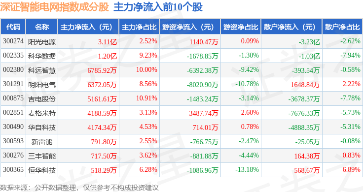资金流向方面,深证智能电网(970054)指数成份股当日主力资金净流入合计3.98亿元,游资资金净流出合计9070.01万元,散户资金净流出合计3.08亿元。成份股资金流向详情见下表: