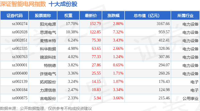 证券之星消息,10月21日,深证智能电网(970054)指数报收于3728.06点,涨2.77%,成交336.67亿元,换手率3.41%。当日该指数成份股中,上涨的有47家,科远智慧以10.0%的涨幅领涨,下跌的有2家,海得控制以1.07%的跌幅领跌。