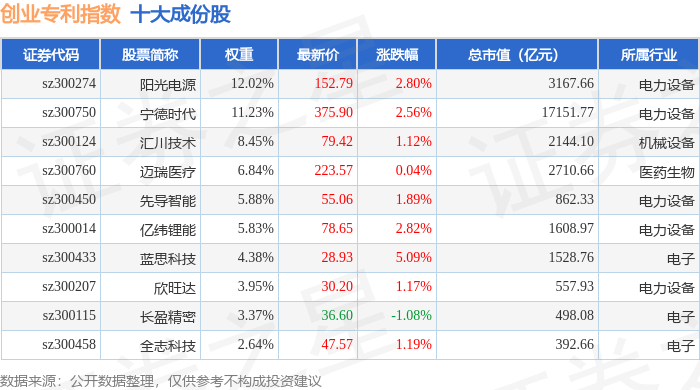 创业专利(970068)指数十大成份股详情如下: