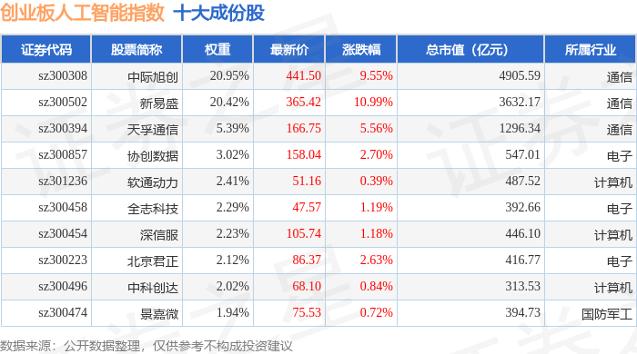 创业板人工智能(970070)指数十大成份股详情如下: