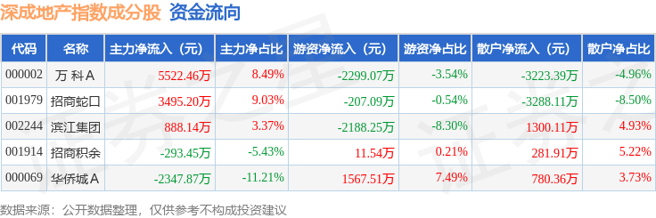 资金流向方面,深成地产(971001)指数成份股当日主力资金净流入合计7264.47万元,游资资金净流出合计3115.36万元,散户资金净流出合计4149.11万元。成份股资金流向详情见下表: