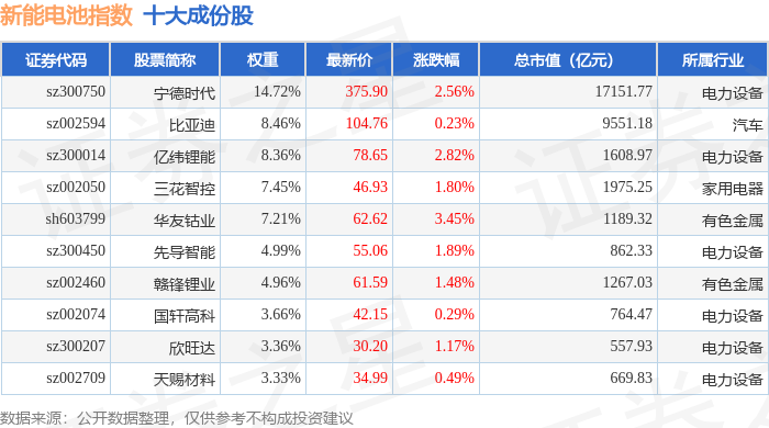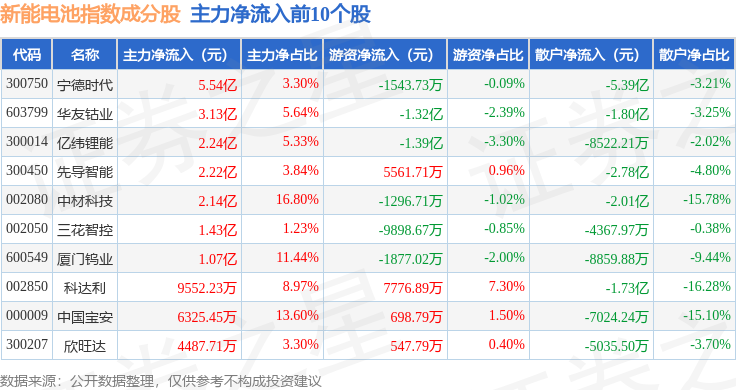 资金流向方面,新能电池(980032)指数成份股当日主力资金净流入合计16.76亿元,游资资金净流出合计1.09亿元,散户资金净流出合计15.67亿元。成份股资金流向详情见下表: