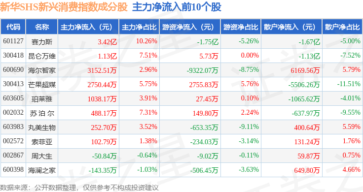 资金流向方面,新华SHS新兴消费(989006)指数成份股当日主力资金净流出合计3.6亿元,游资资金净流出合计3.11亿元,散户资金净流入合计6.72亿元。成份股资金流向详情见下表: