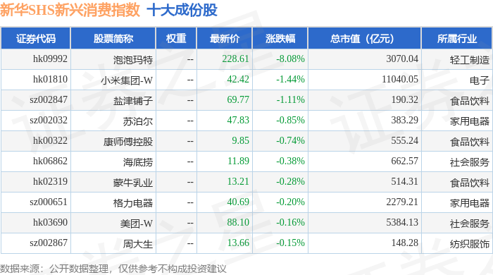 新华SHS新兴消费(989006)指数十大成份股详情如下: