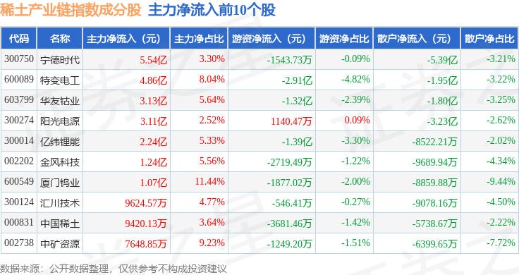 资金流向方面,稀土产业链(989013)指数成份股当日主力资金净流入合计15.97亿元,游资资金净流出合计3.87亿元,散户资金净流出合计12.1亿元。成份股资金流向详情见下表: