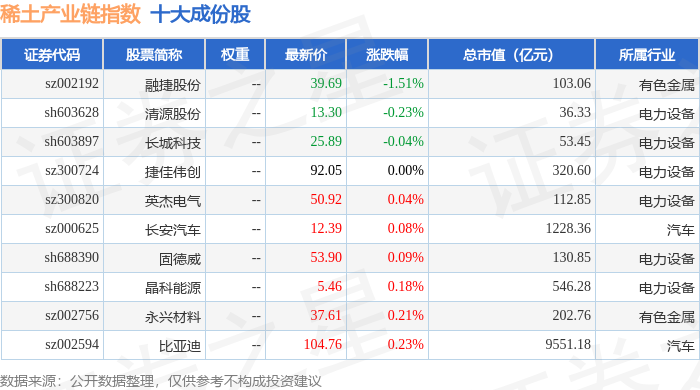 稀土产业链(989013)指数十大成份股详情如下: