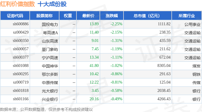 红利价值(989016)指数十大成份股详情如下: