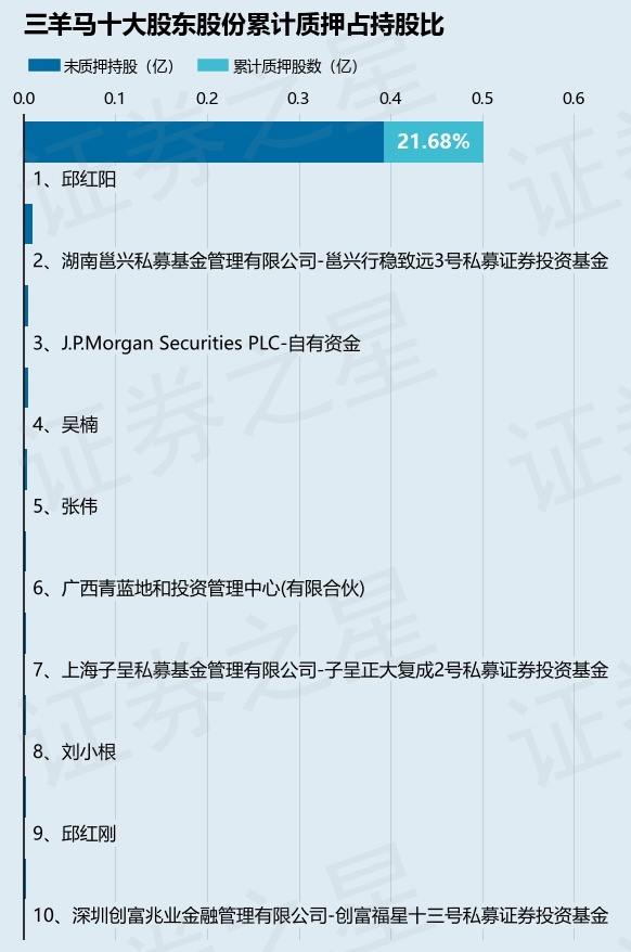 截止本公告日,股东邱红阳已累计质押股份1087.5万股,占其持股总数的21.68%。本次质押后三羊马十大股东的累计质押股份占持股比例(占持股比例的计算以公司最新一期财务报表公布的十大股东的持股总数为基准)见下图: