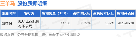 证券之星消息,三羊马(001317)10月21日公开信息显示,股东邱红阳向红塔证券股份有限公司合计质押437.5万股,占总股本5.47%。质押详情见下表: