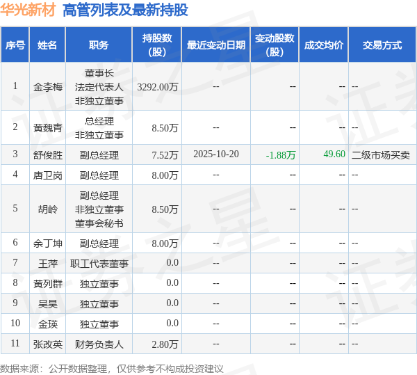 华光新材的高管列表及最新持股情况如下: