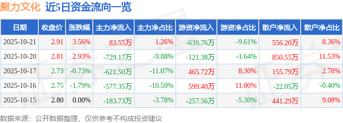 证券之星消息,截至2025年10月21日收盘,聚力文化(002247)报收于2.91元,上涨3.56%,换手率3.62%,成交量23.27万手,成交额6654.01万元。