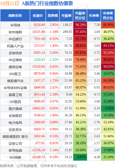 热门行业指数方面,半导体的市盈率百分位较高,为98.29%。而800消费的市盈率百分位较低,为8.87%。
